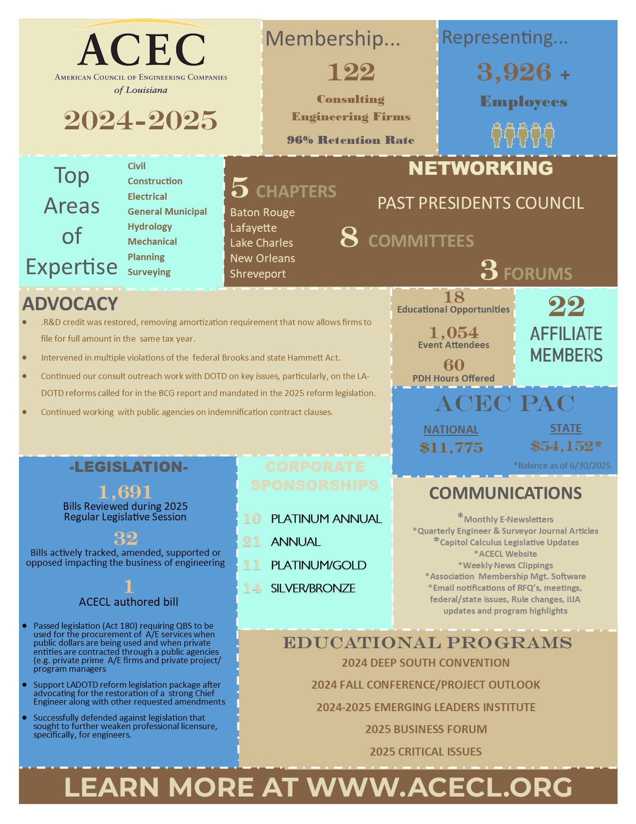 Monthly newsletters, Capitol Calculus (legislative) updates, weekly news clips, and quarterly journal articles kept members informed and connected. Our sponsors at every level played an essential role in supporting ACECL’s advocacy, programming, and member services throughout the year.