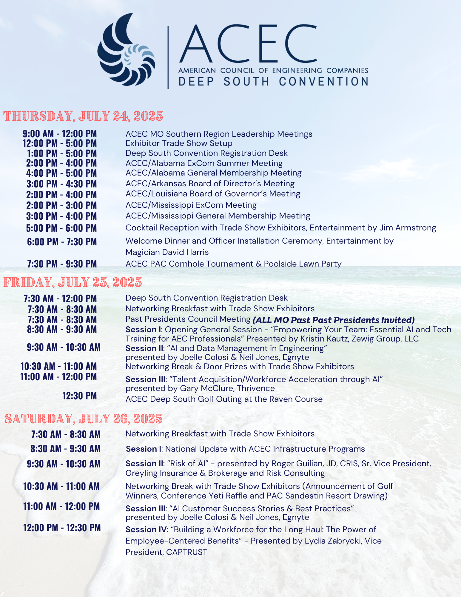 Join owners and key principals from premier engineering and service provider firms throughout the Deep Southern states of Alabama, Arkansas, Louisiana, and Mississippi bayside at the Sandestin Golf & Beach Resort, located 9300 Emerald Coast Pkwy West in Miramar Beach, Florida. This year's convention and exhibitor trade show will be held on July 24 - 26, 2025.